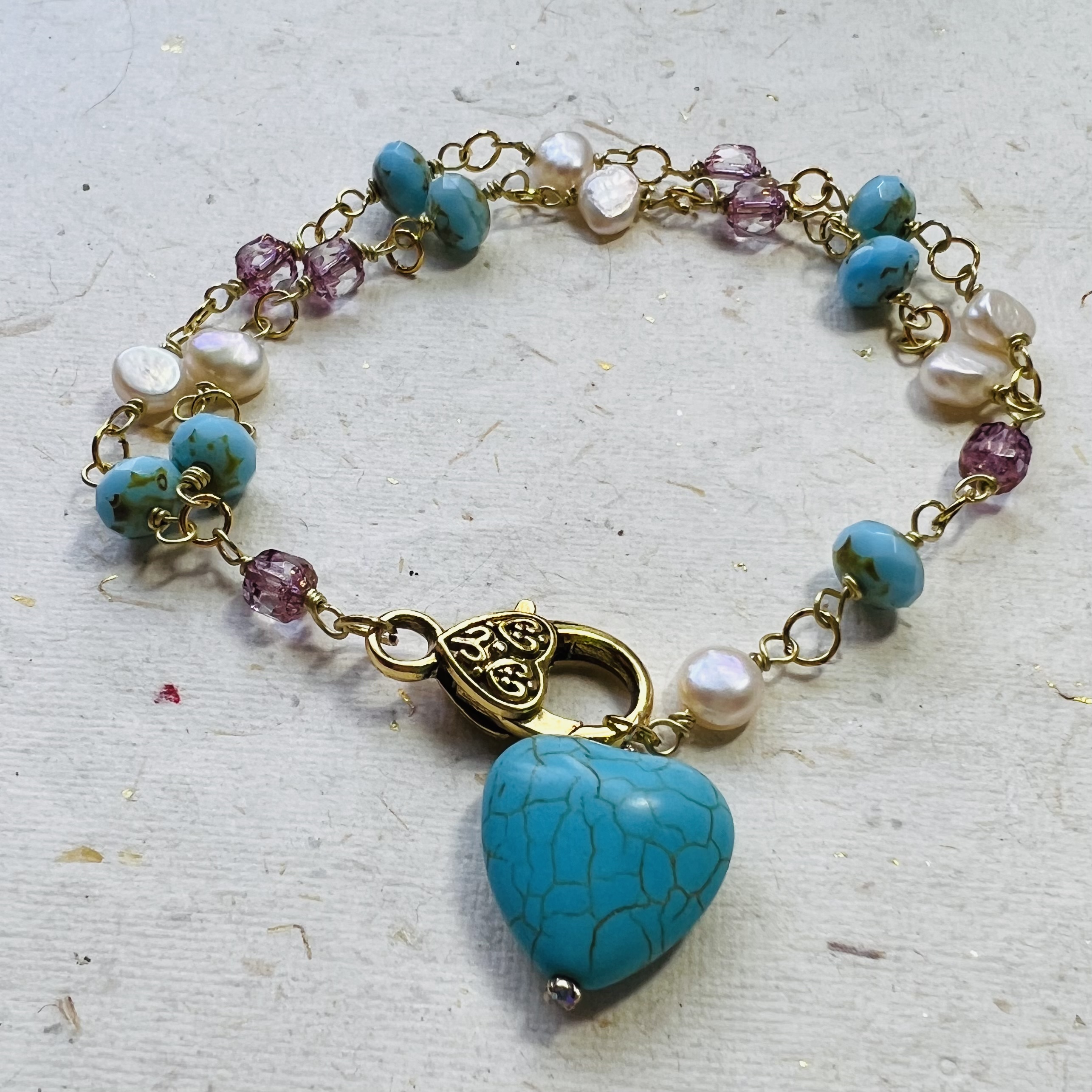 Don't Go Breaking My Heart $35.00 Czech beads, freshwater pearls, and turquoise howlite heart