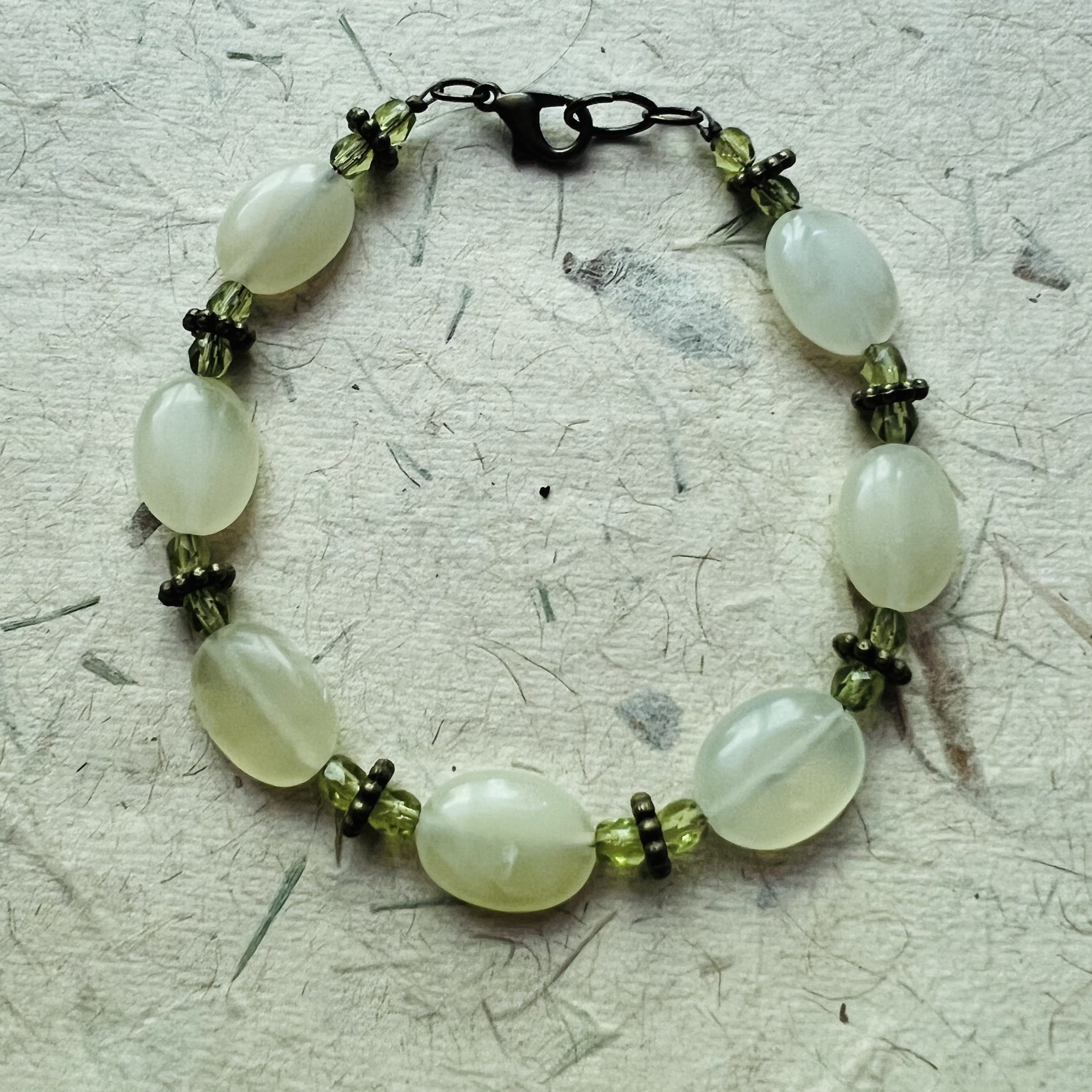 | Jonquil Bracelet $25.00 Pale yellow jade with green Czech beads