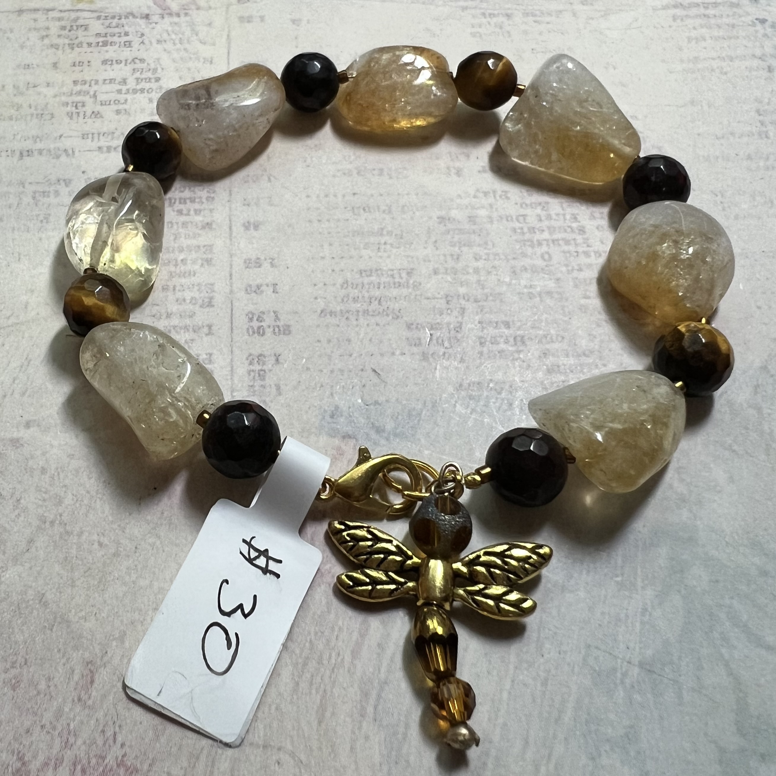 | Citrine Bracelet $30.00 Citrine and tiger's eye beads with dragonfly charm
