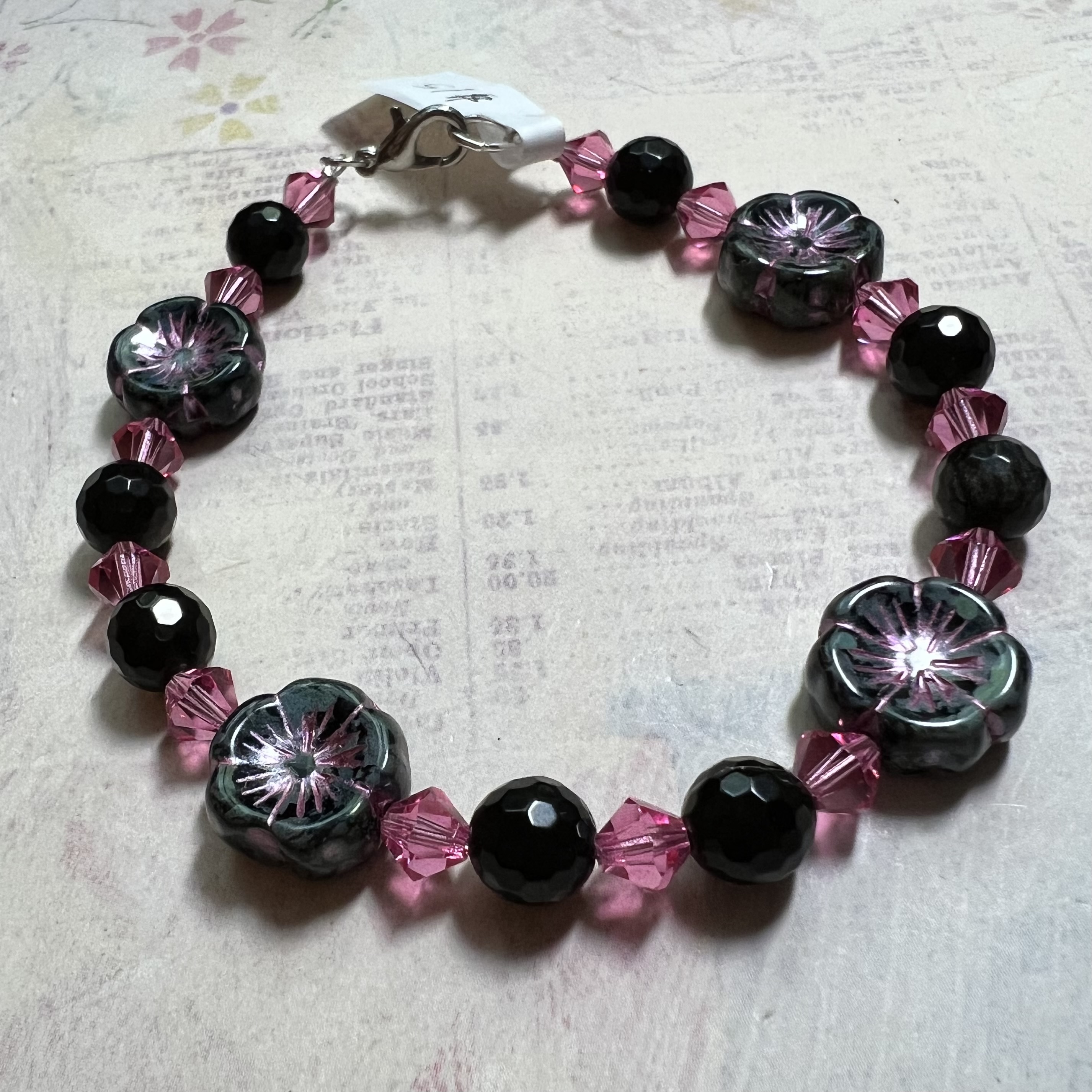 Tropical Night Bracelet $15.00 Czech flower and pink beads with faceted onyx
