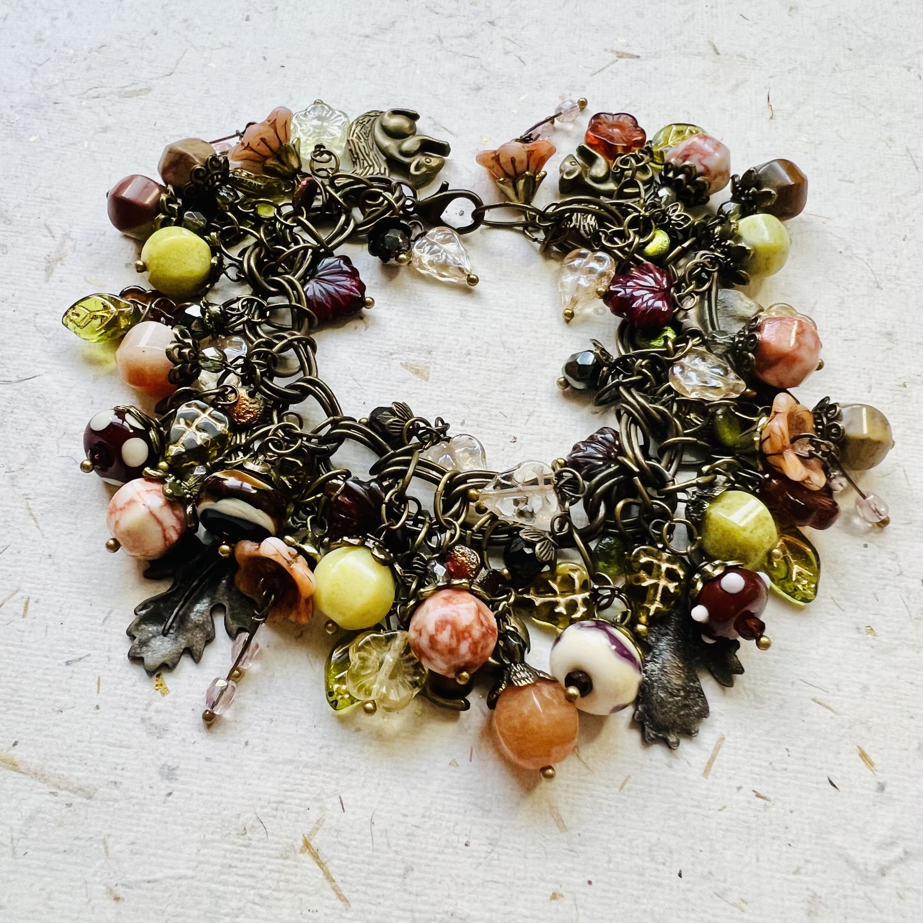 | Golden Autumn Bracelet $90.00 Semi-precious stones, one of a kind lampwork beads, Czech beads and brass squirrel and leaf charms