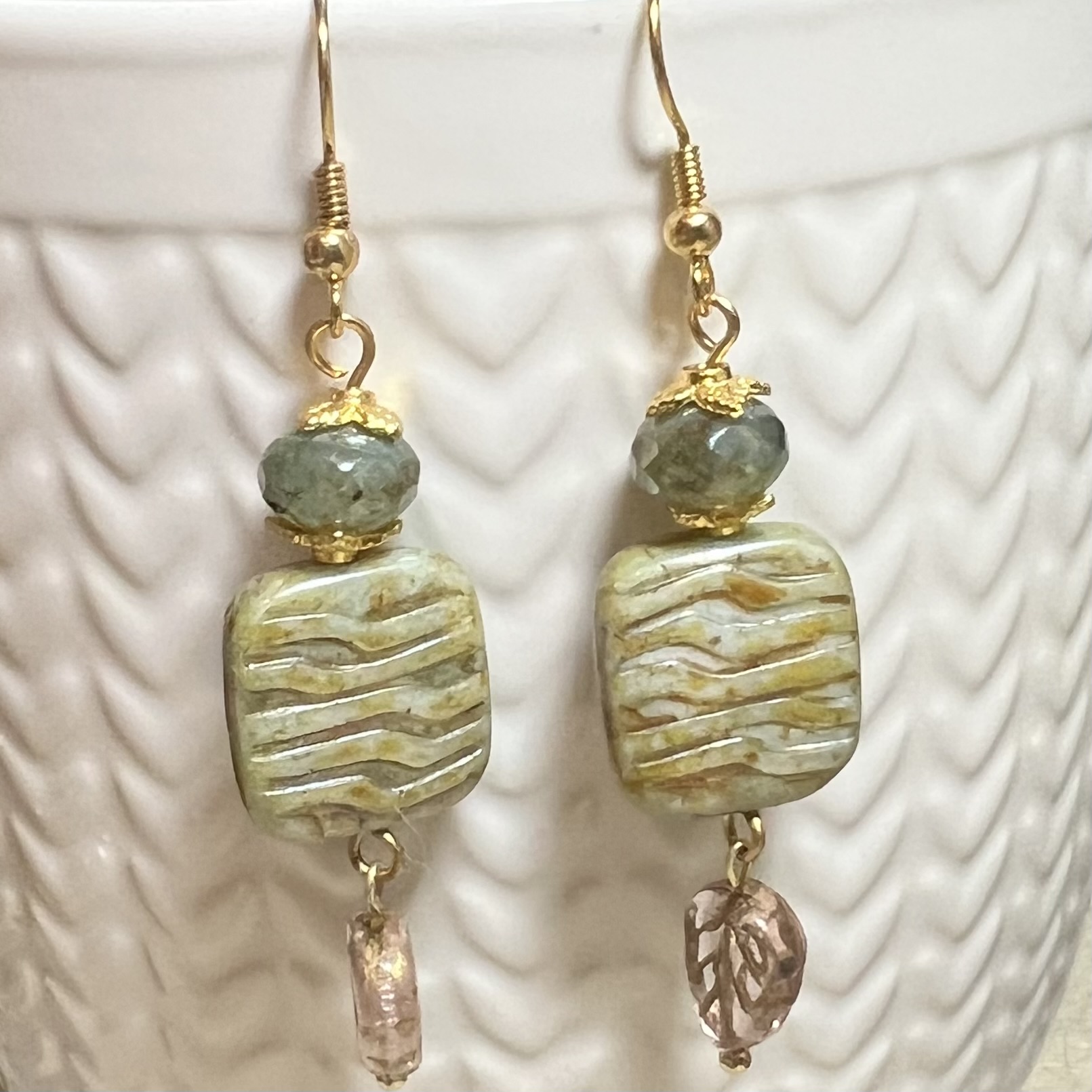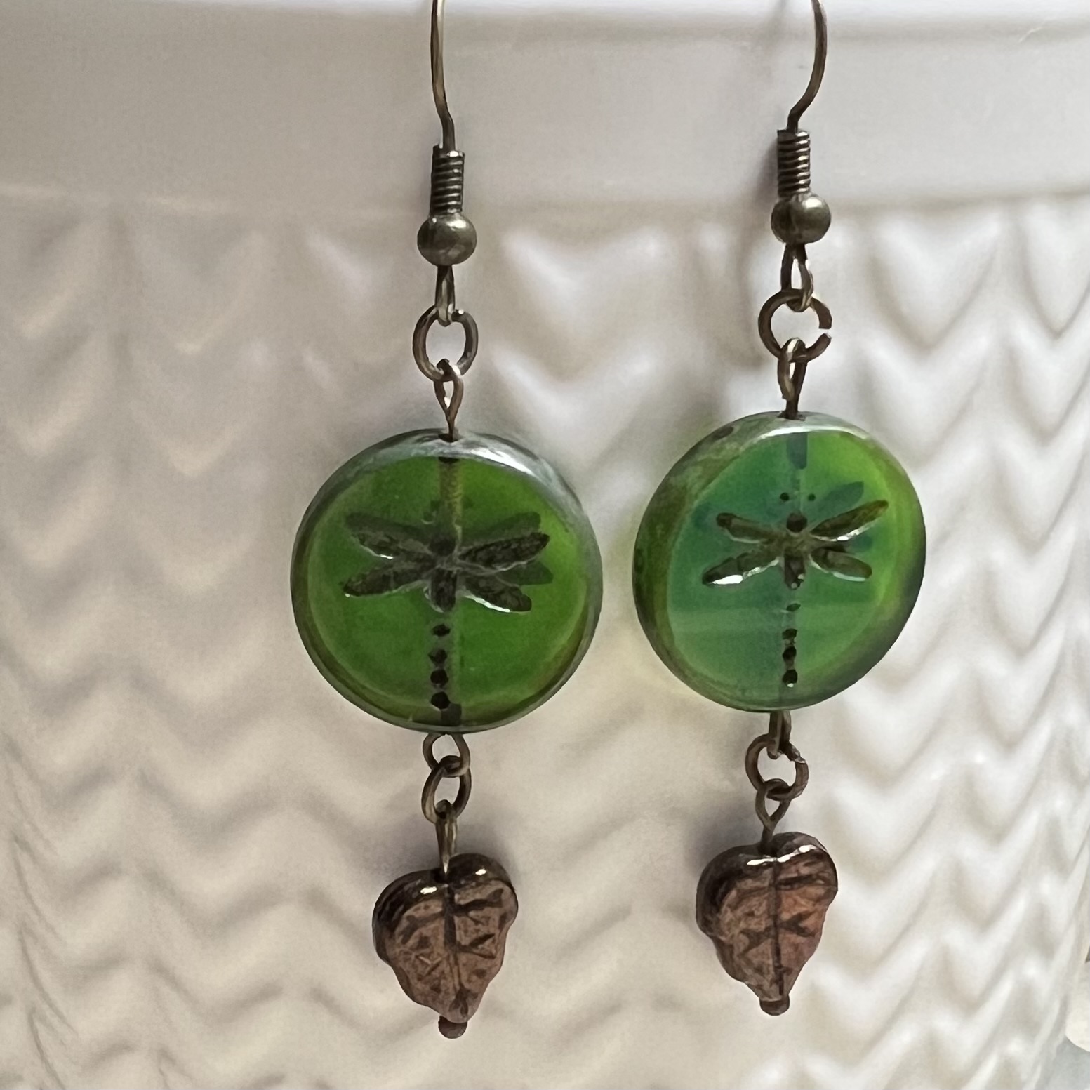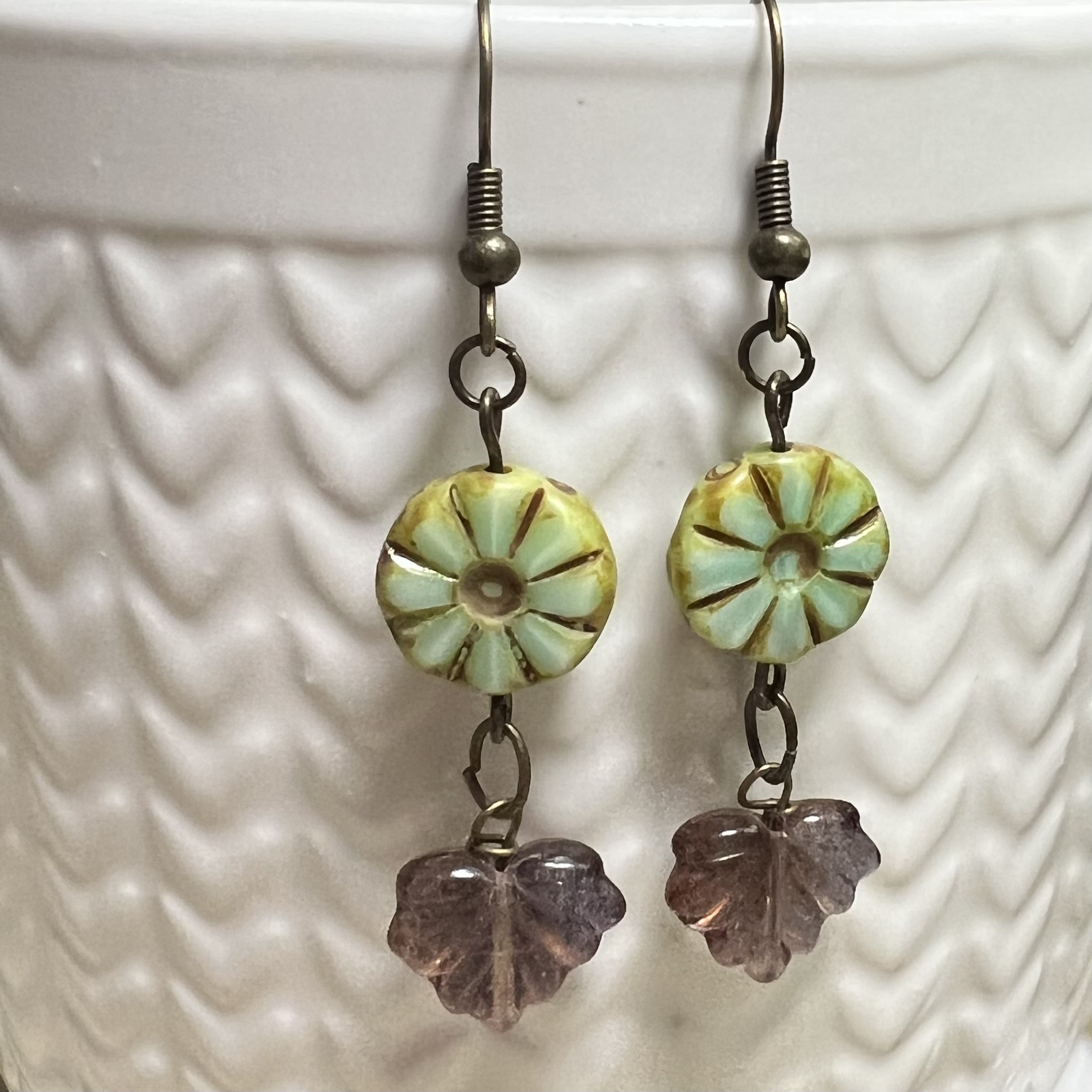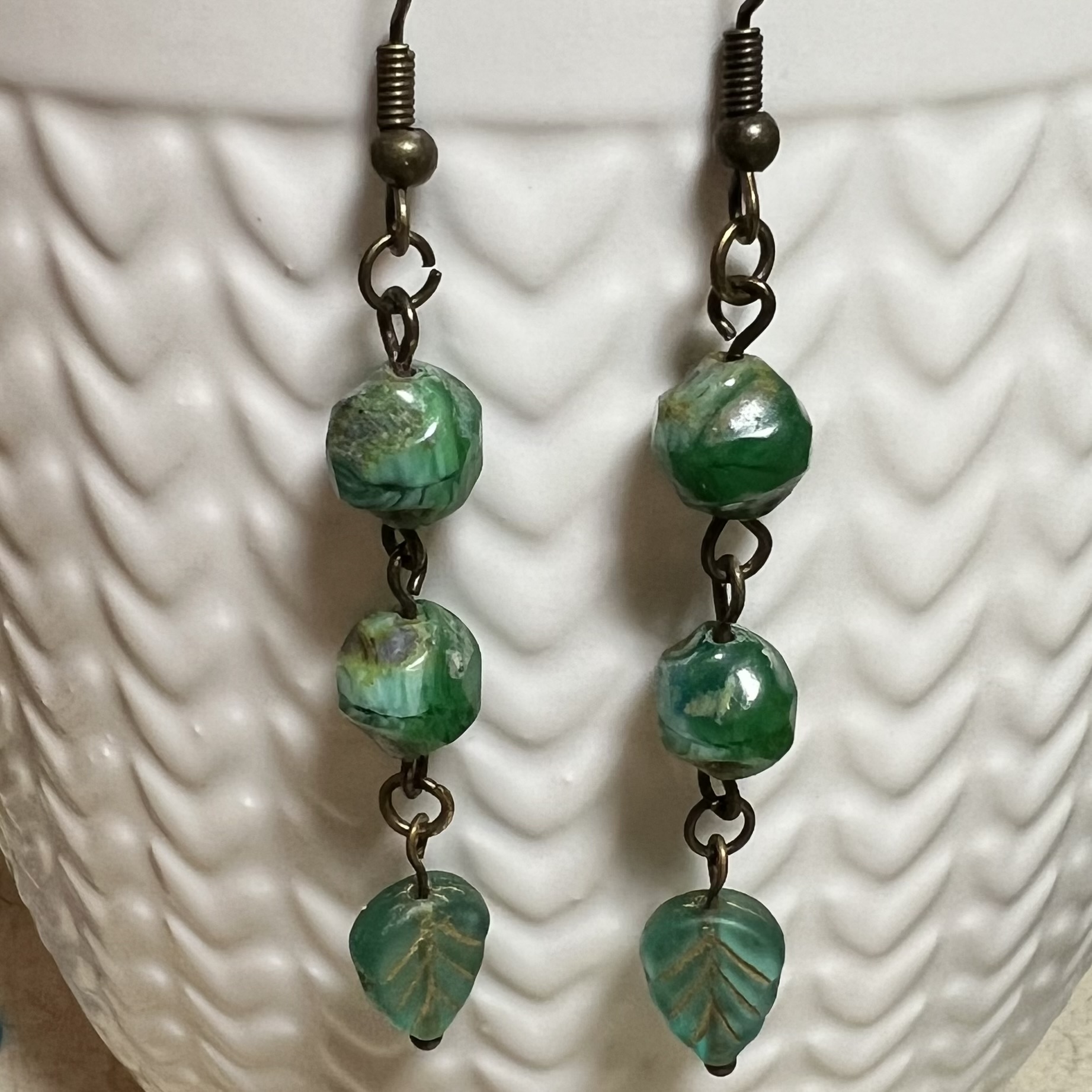 | Misty Grove Earrings $15.00 Czech beads and leaf dangle