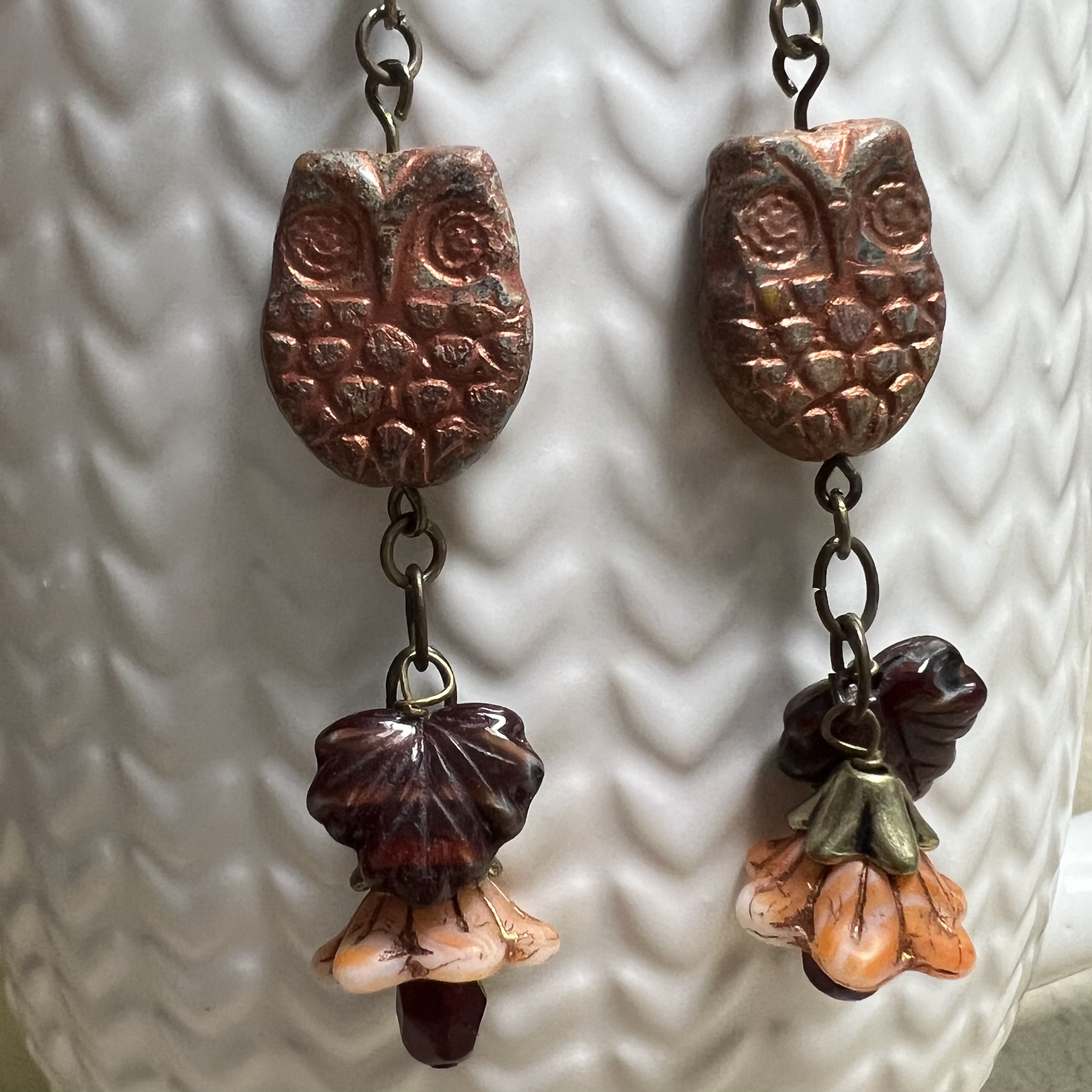 Owl Earrings $20.00 Czech owl beads with blossoms and leaves. 2.25" long