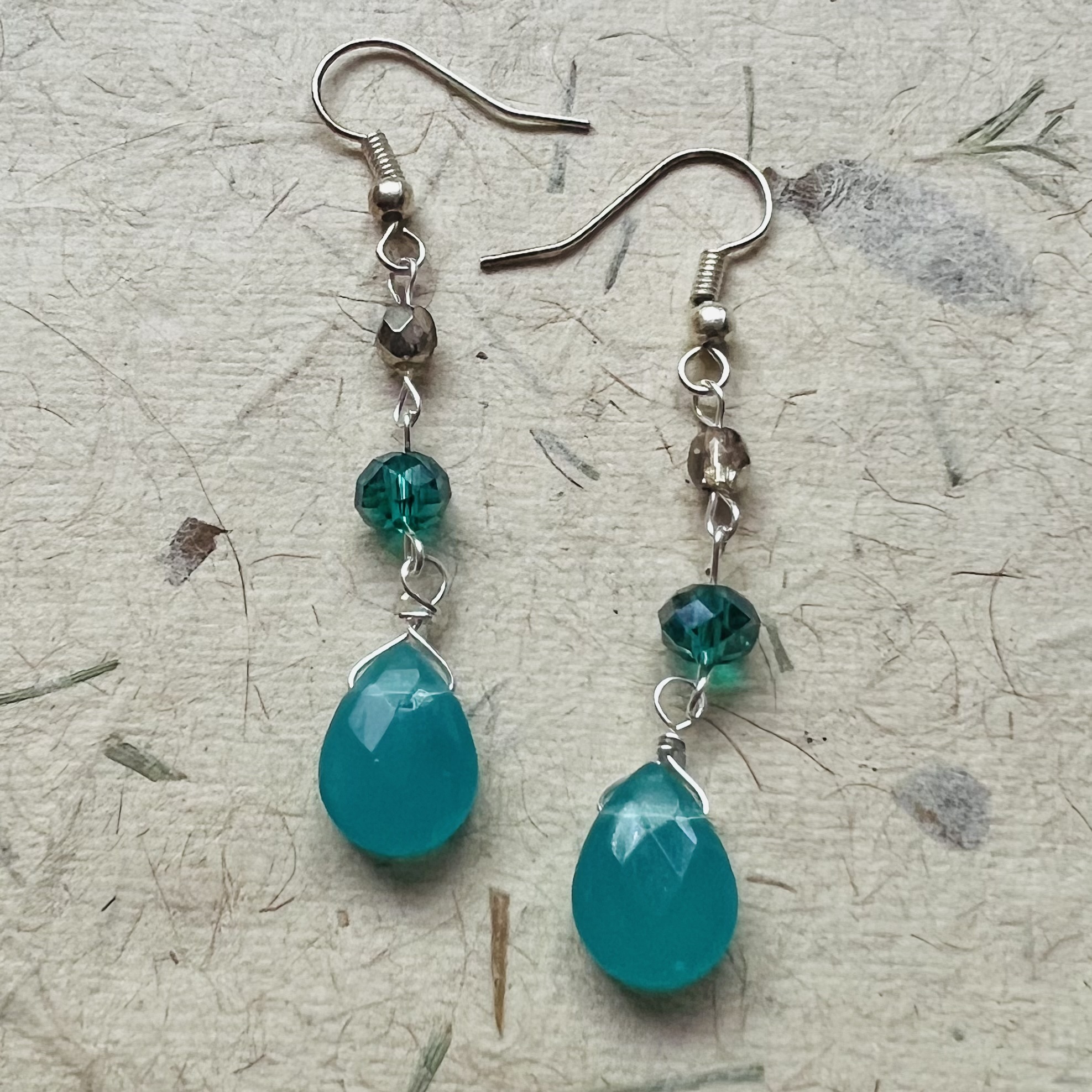 Teal Drop Earrings $15.00 Teal colored Czech beads and teardrops. 1.5" long.