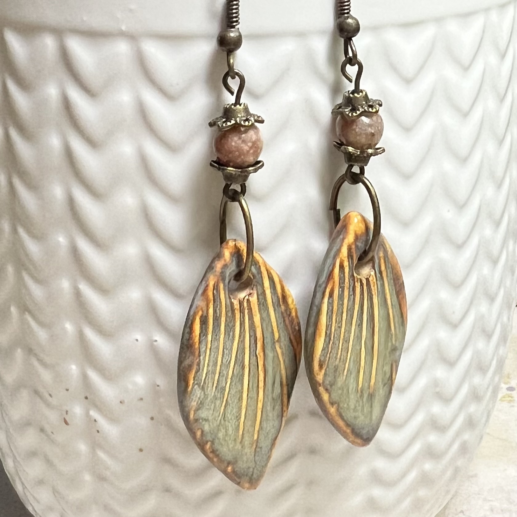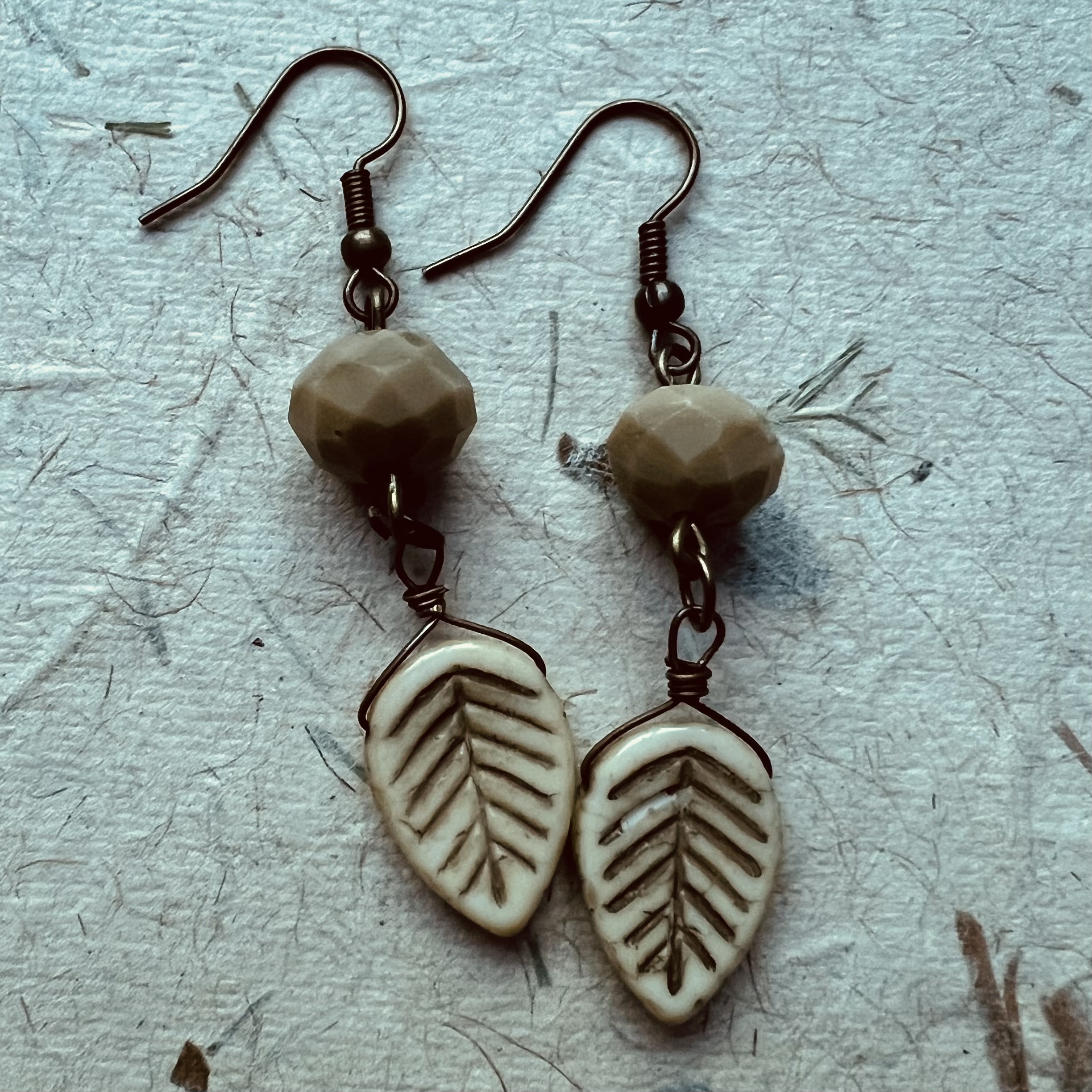 | Leaf Earrings $20.00 Handmade ceramic leaves with unakite. 2.25" long