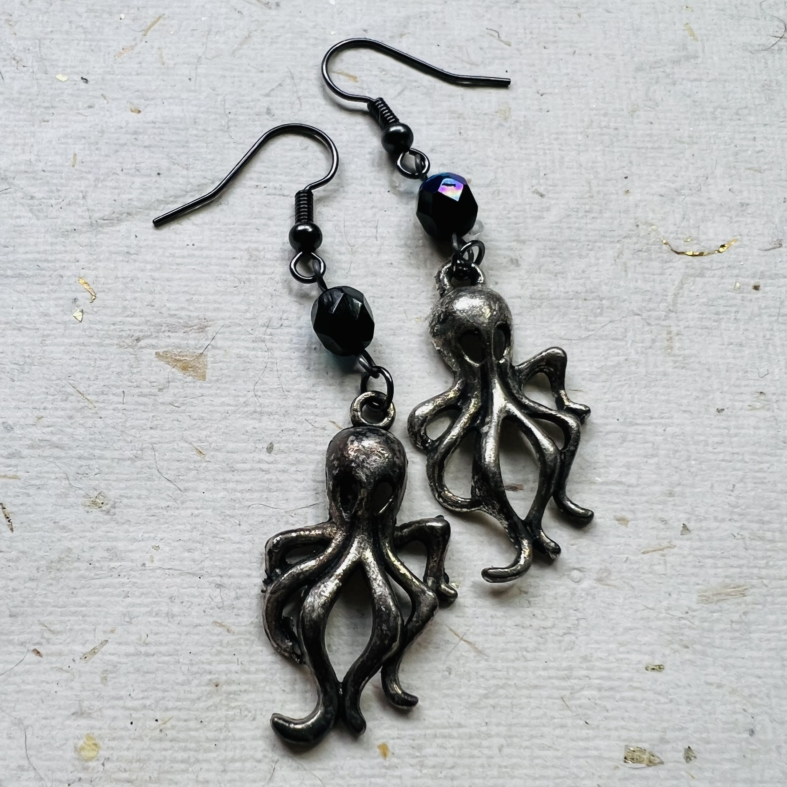| Octopus Earrings $10.00 Octopus charms with Czech beads and silvertone ear wires.