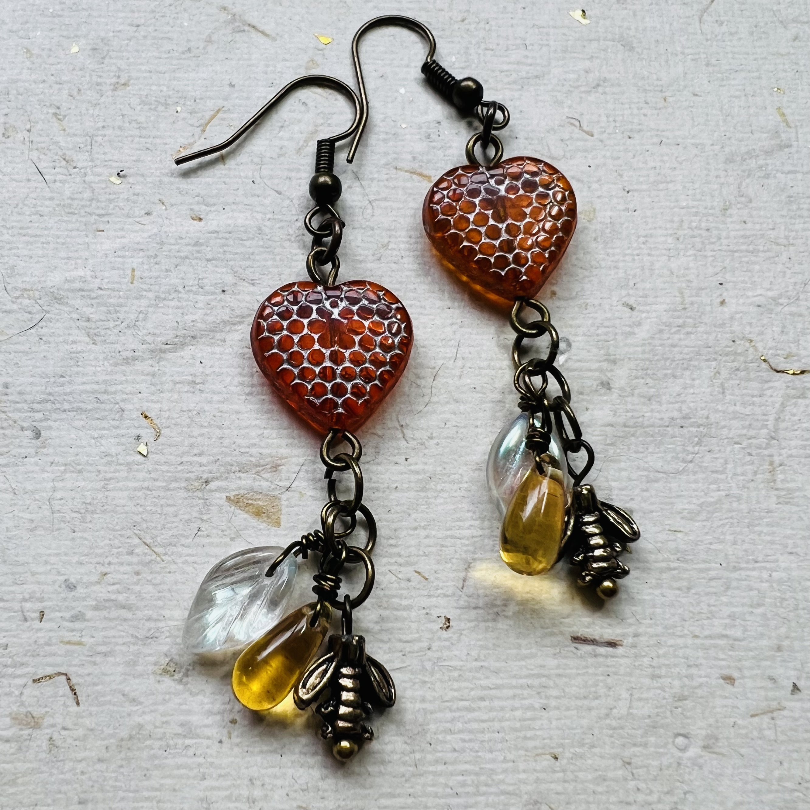 Bee Still My Heart Earrings $18.00 Beehive print heart with brass bees earrings. 2" long