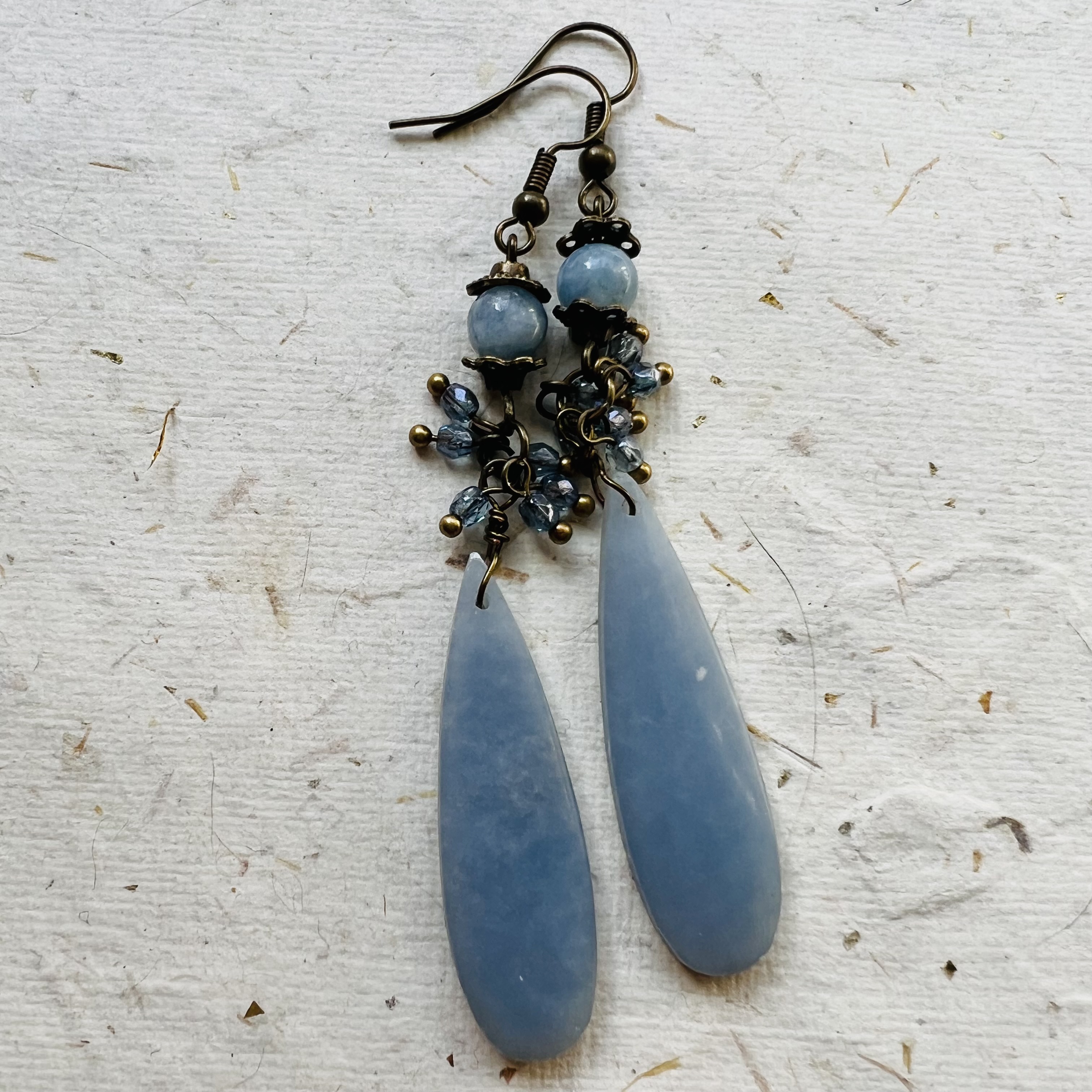 | Kyanite Earrings $50.00 Kyanite dangles with Czech beads and brass. 3" long