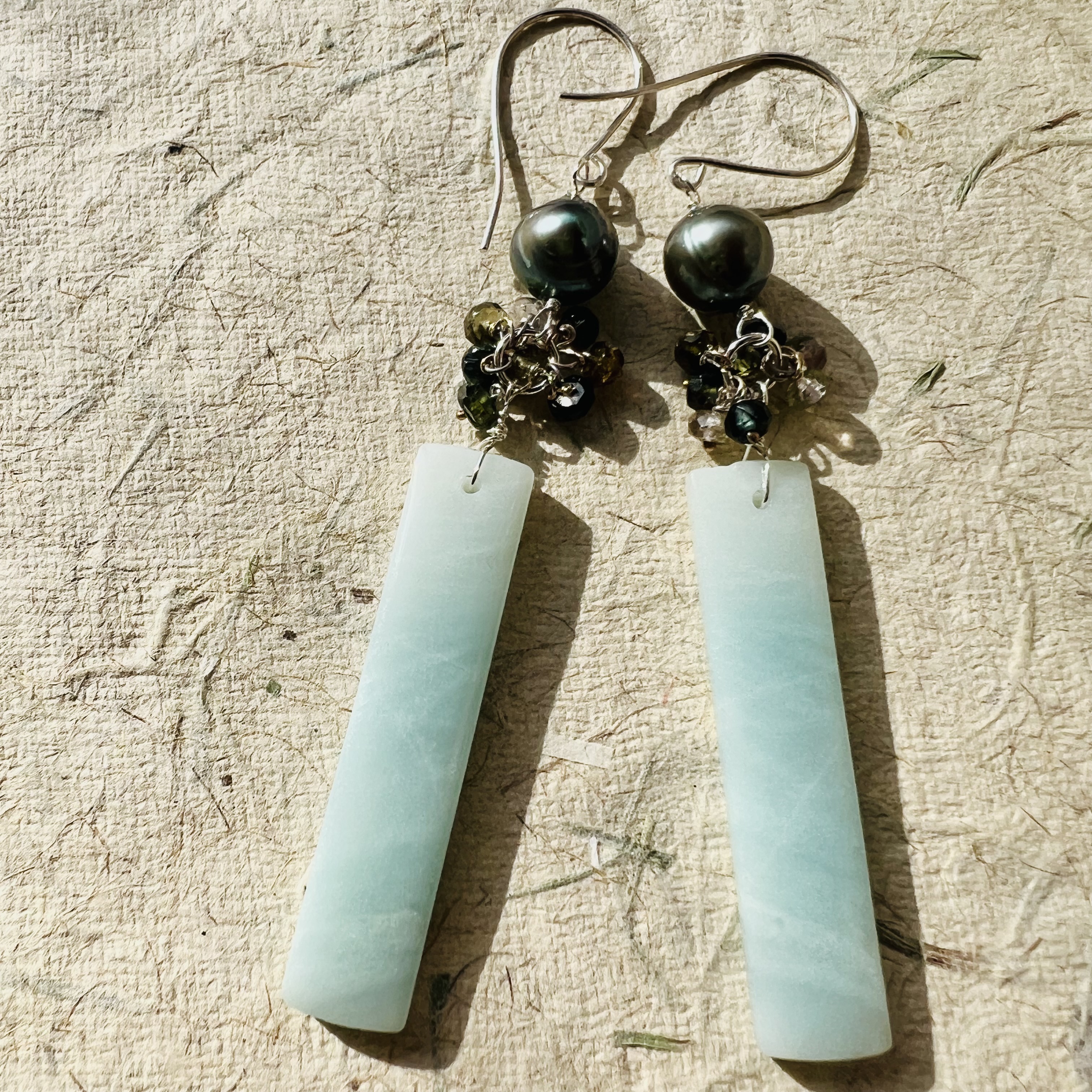 Sea and Sky Earrings $50.00 Amazonite dangles with freshwater pearts and Czech beads. 2.5" long