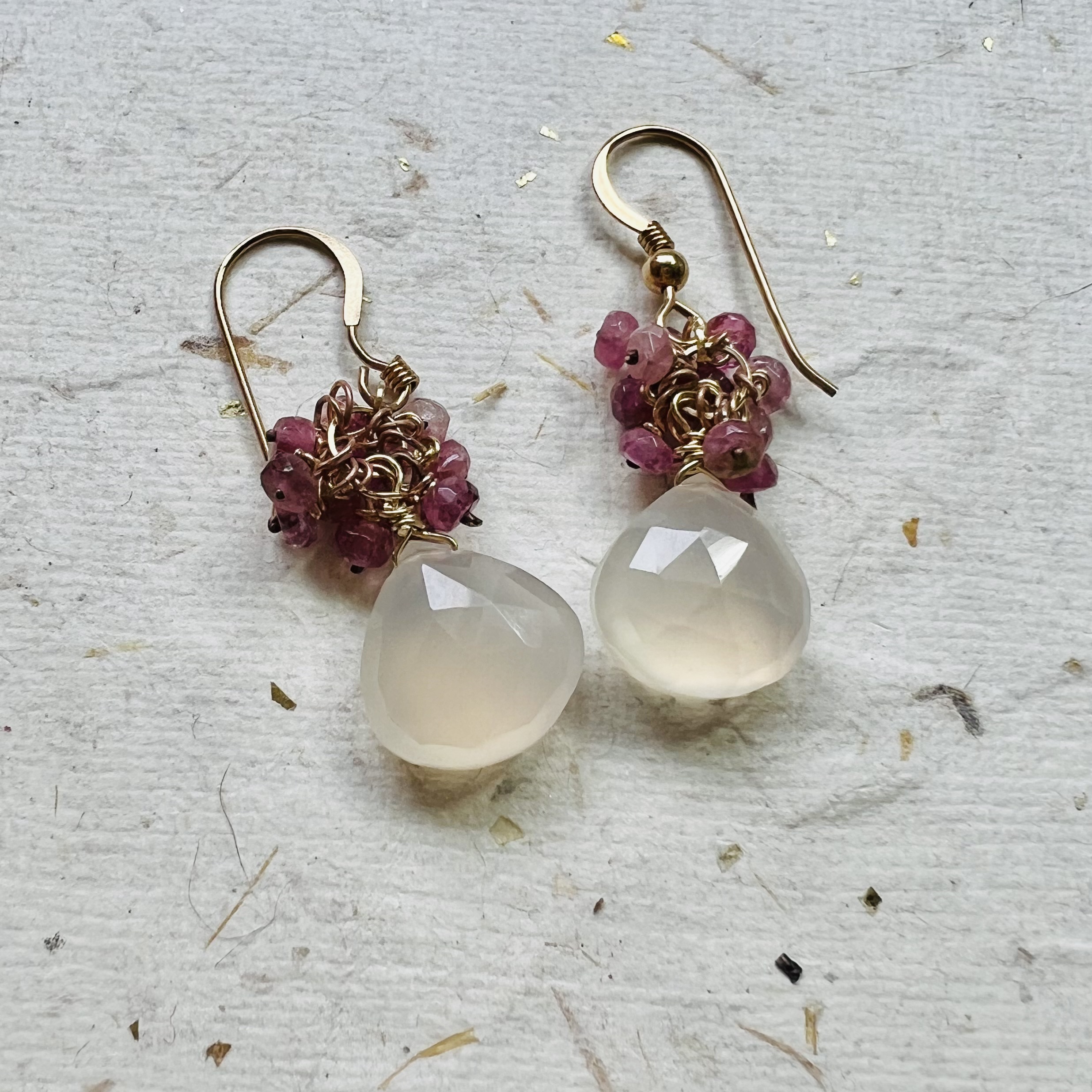 | Love and Roses Earrings $120.00 Rose quartz drops with pink tourmaline and 18k goldfilled wires. 1" long