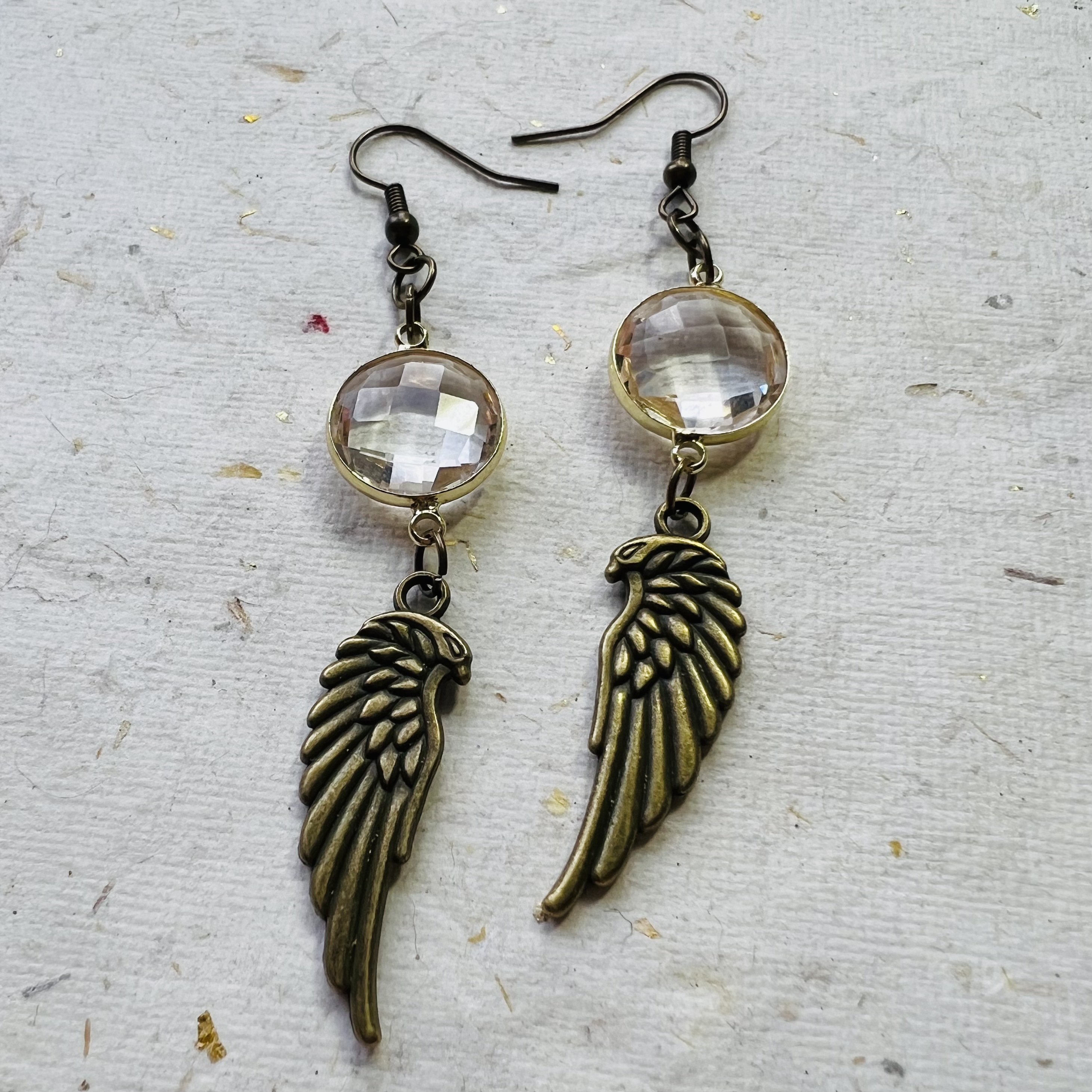 | Winged Earrings $15.00 Brass wing charms with Czech crystal. 2.5" long